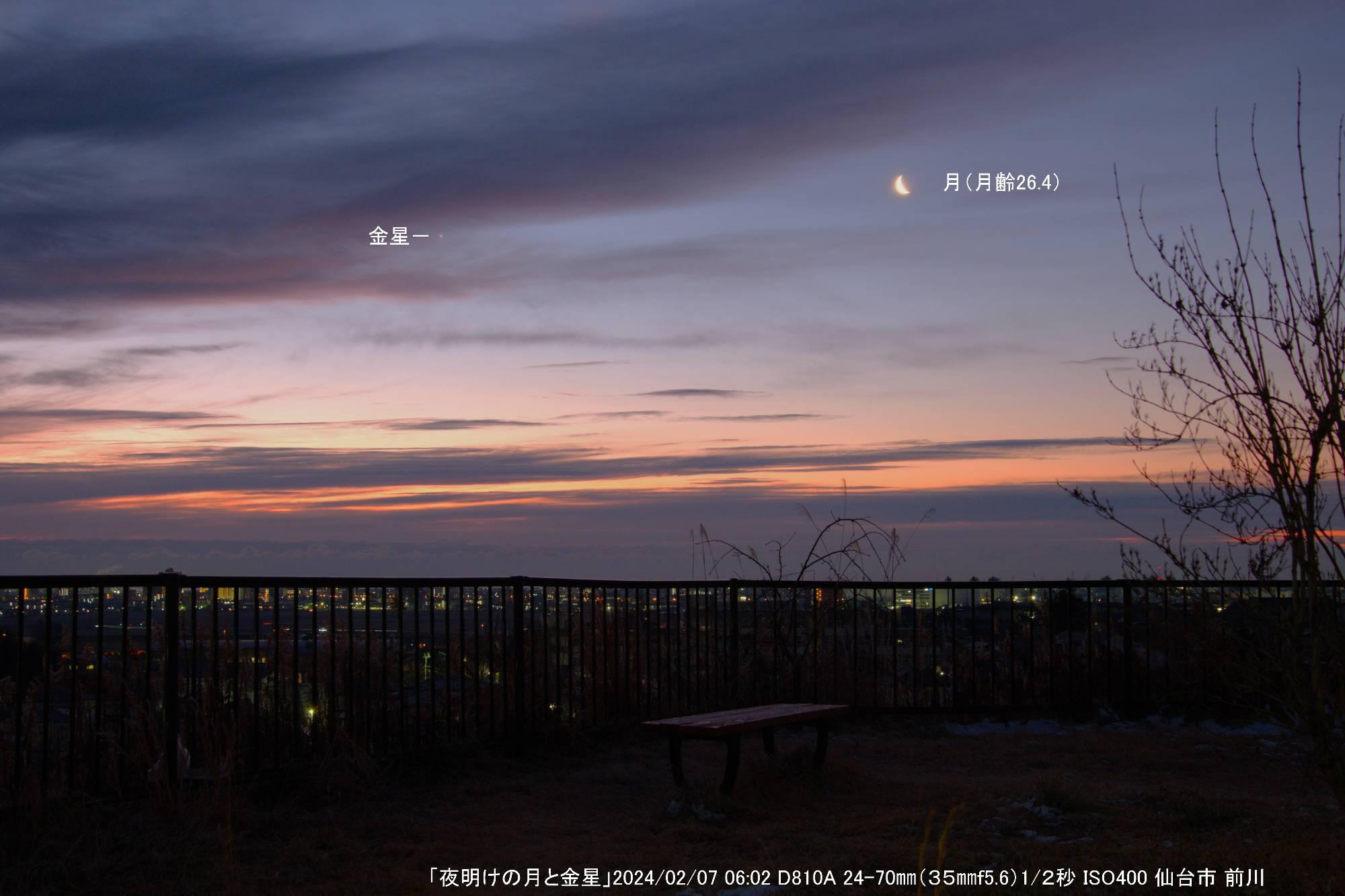 快晴とはいきませんでしたが、雲の隙間から金星が覗き、月齢26.4の細い月が見られました。