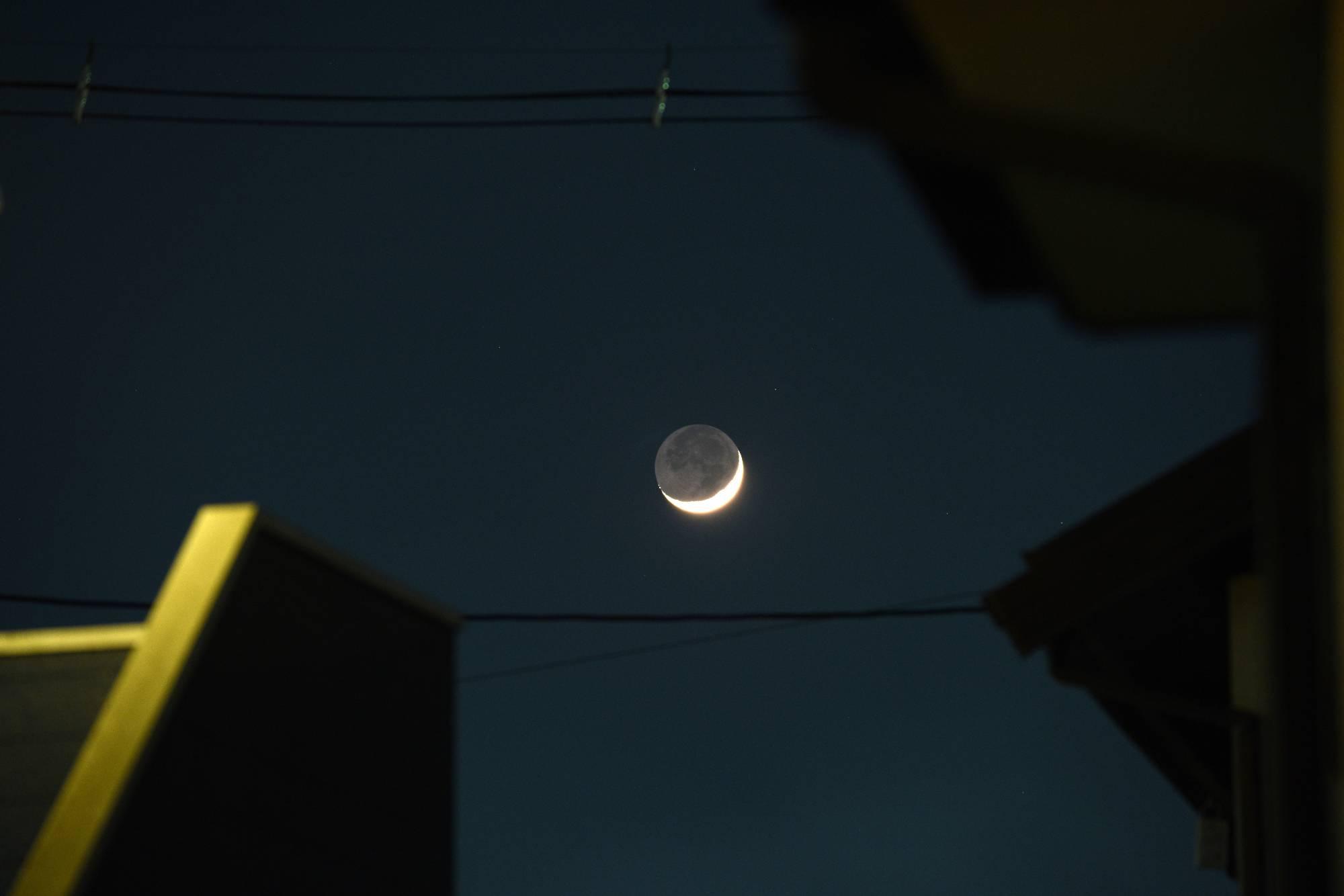 2024/1/14 どんと祭の帰り道、きれいな三日月を見ようと散歩に出ました。家と家のすき間から三日月を発見しました。望遠ズームレンズ230㎜で撮影しました。月齢2.9でした。