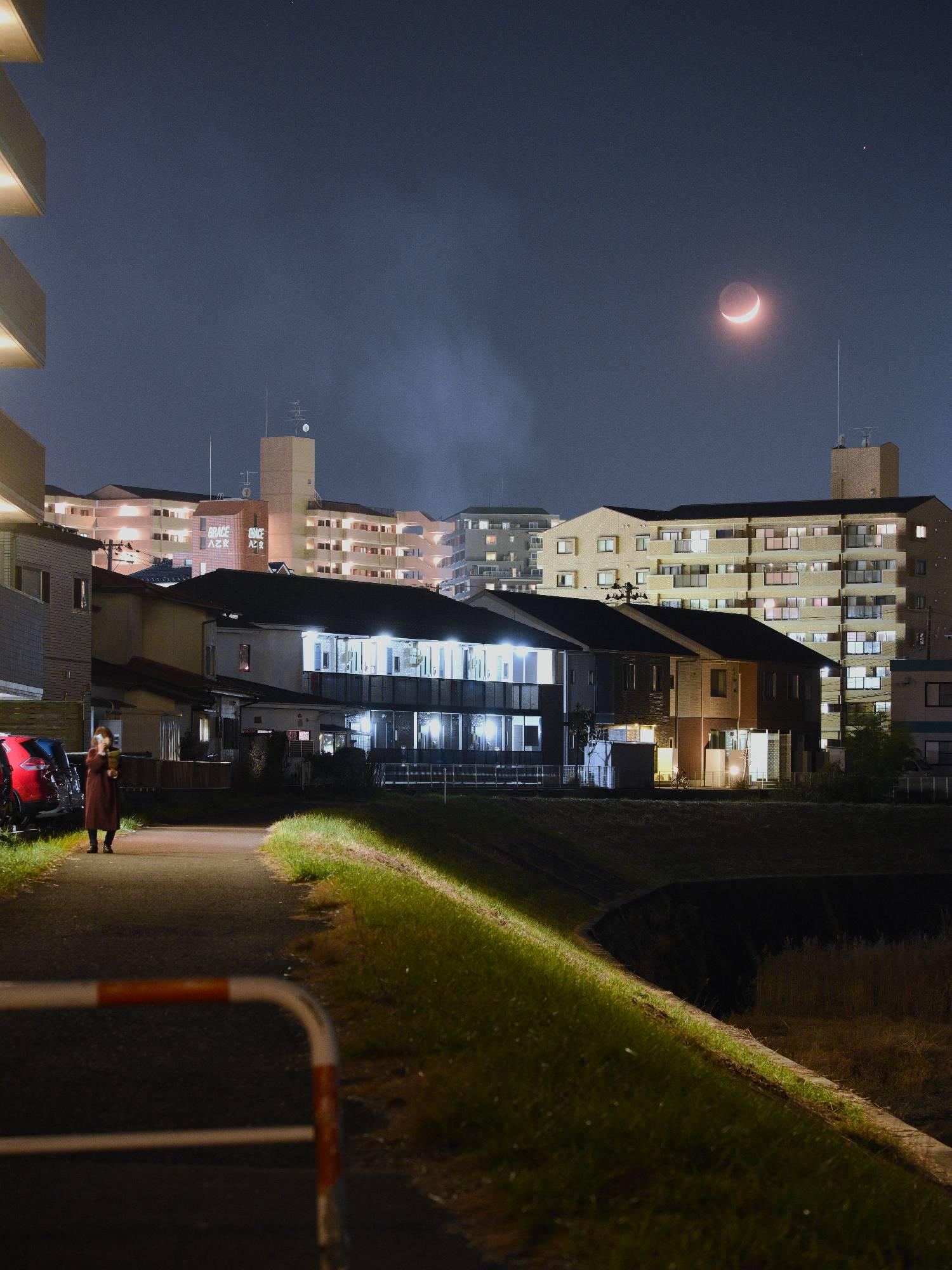 どんと祭の帰り道三日月を見ようと散歩に出ました。川の土手を歩いていると次に発見したのは三日月の斜め右上に土星が輝いています。また,建物の背後からは、先ほどお邪魔した境内のどんと祭の現場から立ち上る煙も上がっていました。