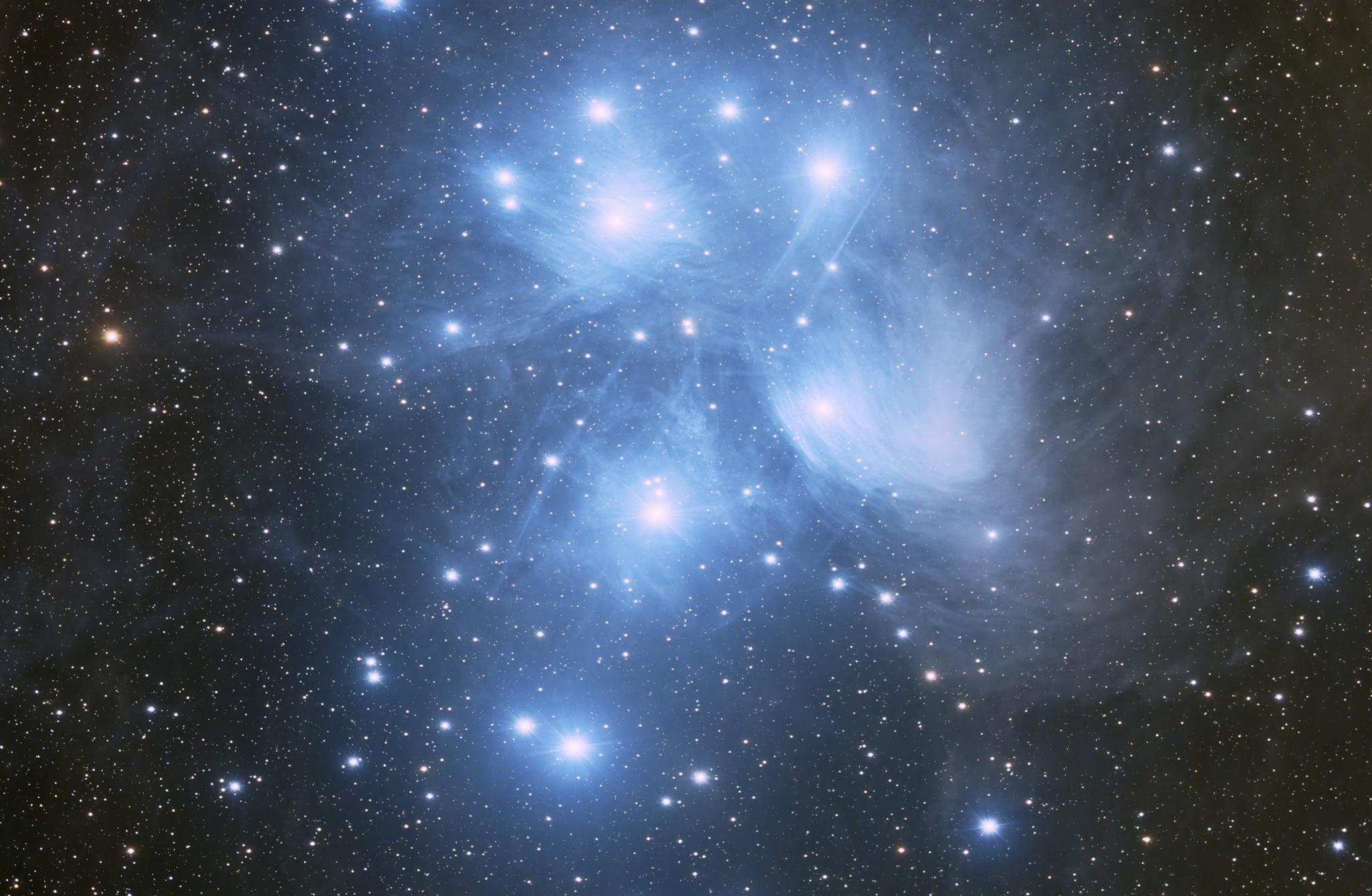 M45すばるをアメリカのユタ州のリモート望遠鏡で撮影しました。機材はセレストロンのRASA11/D279mm/f620mm/F2.2にZWOのASI071C(カラーCMOSカメラ)なのですが$40の月会費だけで毎日30分間つかえるものです。今回は1月14日、15日の2日間に分けて撮影した計32.5分(150秒x13枚)の露出分をコンポジットしています。F2.2と明るいので短時間露出でも十分に写すことができるようです。