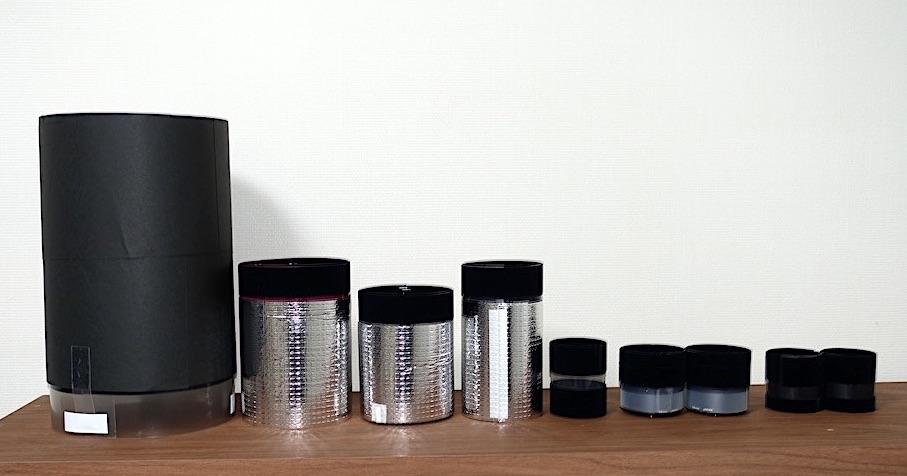 市街地にあるマンション7階のバルコニーで変光星を目測しているのですが、近隣のマンションや広告塔の照明などの光が鏡筒内に入射して視野が明るくなるのを防ぐために、遮光用フードを自作して使っています。左から、15cm, F5反射用(鏡筒内にも植毛紙を貼ってます)、8.5cm, F7アポ屈折用、8cmフィールドスコープ用、6cm, F6アポ屈折用、5cm正立ファインダー用、5cm防振双眼鏡用、そして4cm双眼鏡用です。反射用のフードは直径が約17cmほどです。フードはほぼ同じ構造で、クリヤホルダー必要サイズに切断して丸め、内側に国際光器で購入した植毛紙を貼ってあります。屈折用フードには、フードの放射冷却を少しでも抑えるためにダイソーの流し台シート(アルミ被覆+適度のクッション性材質)を貼っているのですが、このシートの効果は?ですね。