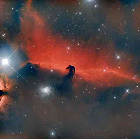 見事な馬頭星雲ですね。昔神戸にいた時、西はりま近くの山中で32cmのドブソニアンを使い、燃える木と一緒に肉眼で見ました。32cmともなるとオリオン大星雲もガスの筋状の流れが見えて見事でした。なお、大星雲の色は写真で見る様なピンク色ではなく、薄い緑色です。Hα線の波長は網膜の感度が低いので、mクラスの望遠鏡でないとピンク色には見えないでしょうね。どうしてもOIIIラインとHβラインの色(500nm近傍)で見えてしまいます。