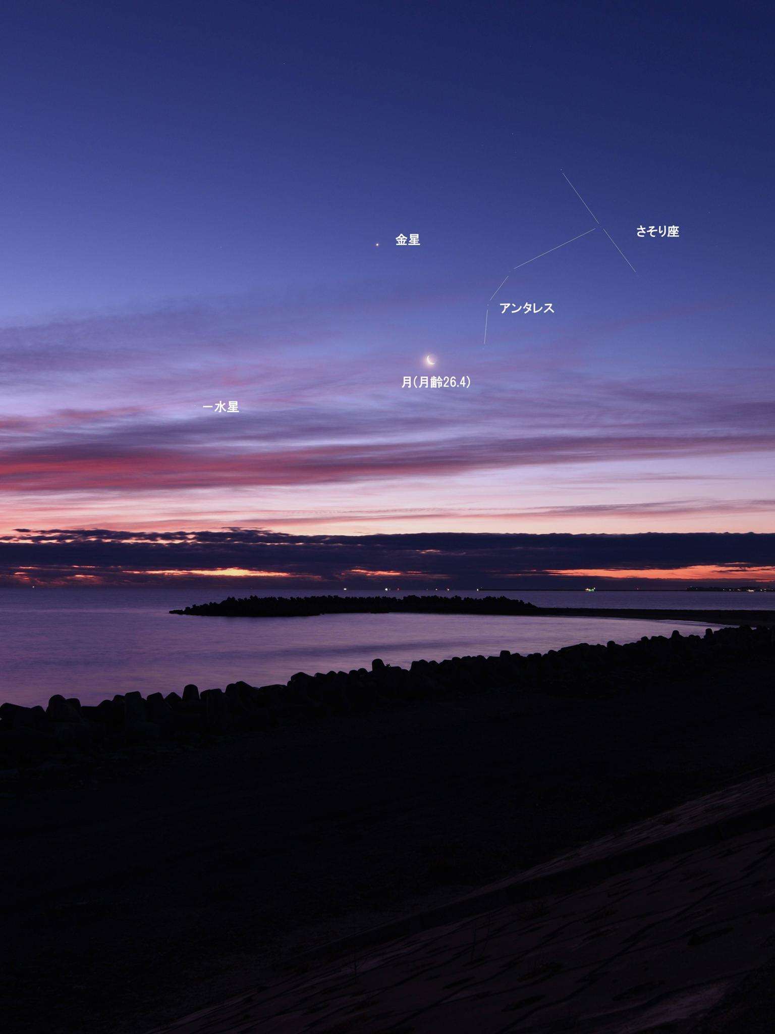 9日朝も寒気が入り氷点下の気温、しかし透明度はまあまあの日の出前、月と金星、水星の接近を観測に山元町へ行きました。