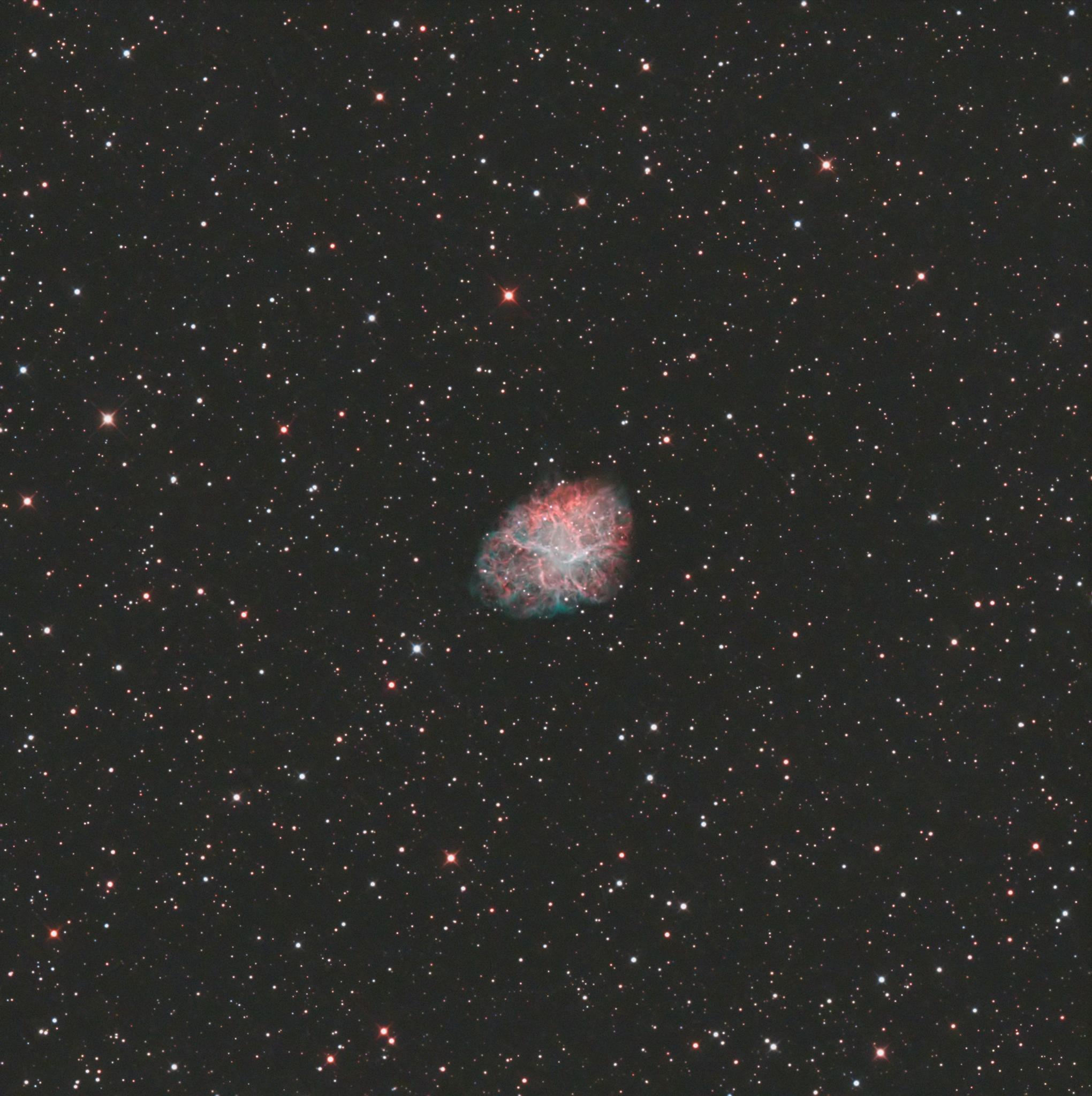 M1のフィラメント構造も見えている感じですね。F7にした事で像が大きくなっただけでなく、ミラーのコマ収差も減少しているのかも知れません。画像処理などデジタル写真の事はよくわかりませんが、ナローバンドフィルタの効果だけでなく、ふじたさんの鏡筒での徹底した迷光対策が、像全体のコントラスト向上に寄与しているのではと思います。
