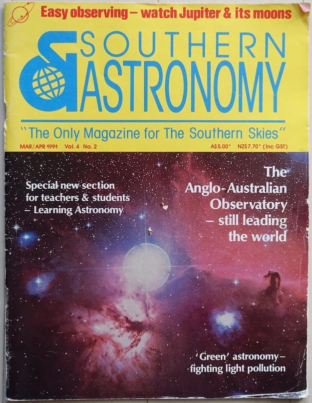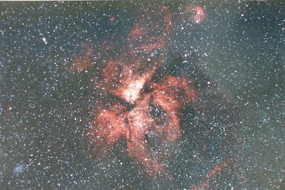 中心のキーホール星雲も見えていますね。あちこち探して、私が撮った昔のイータカリーナ星雲の写真を見つけました。Astronomical Society of Victoria(メルボルンの天文同好会です)の会員だった1991年に、メルボルンの北100kmほどのところにある会員所有の観望地(星明かりで歩けました)で撮影したイータカリーナ星雲です。Nikon 80mm, F6 apochromat鏡筒を五藤のMark-Xにのせ、Ectar1000を入れたNikomat FTnで20分の露出で撮影したものです。スキャナーがないので、手元にある写真をデジカメで撮影しました。これはオーストラリアのSouthern Astronomyという天文雑誌の1991年のMar/Apr号に掲載されました。