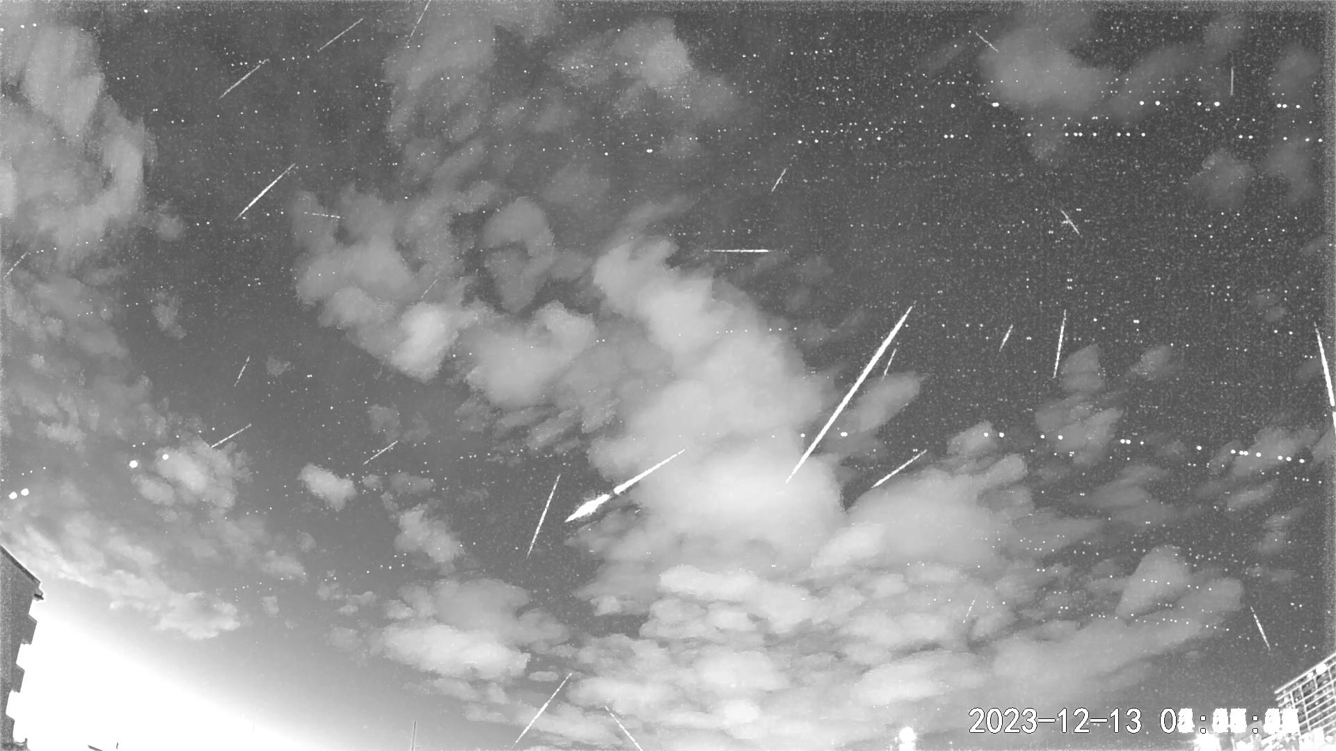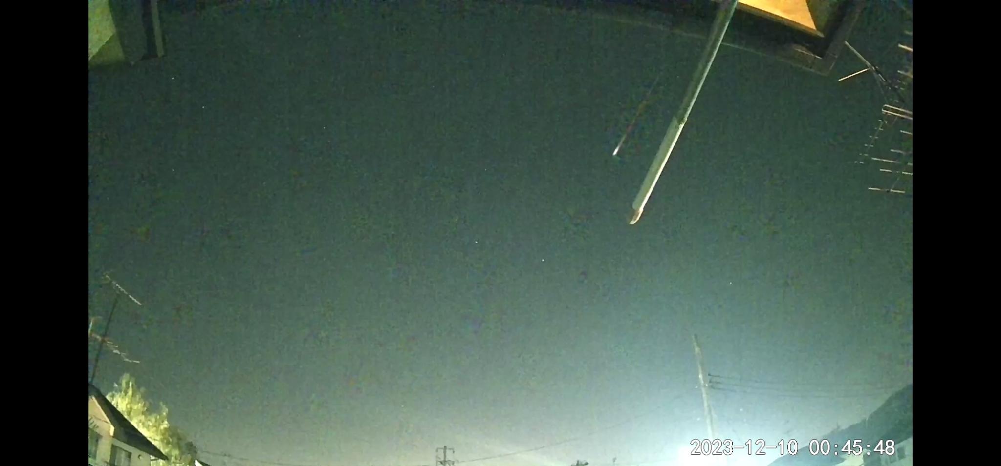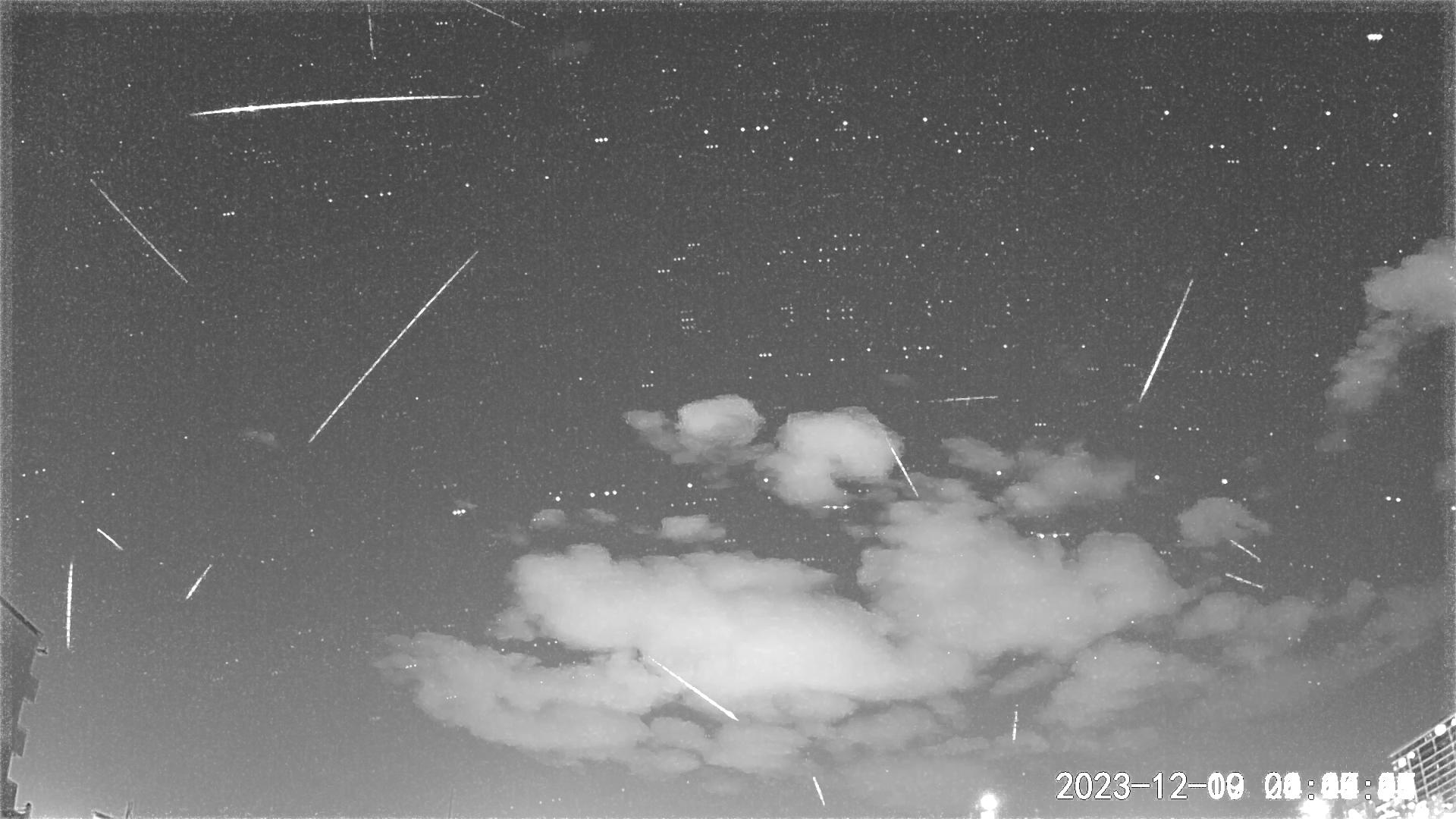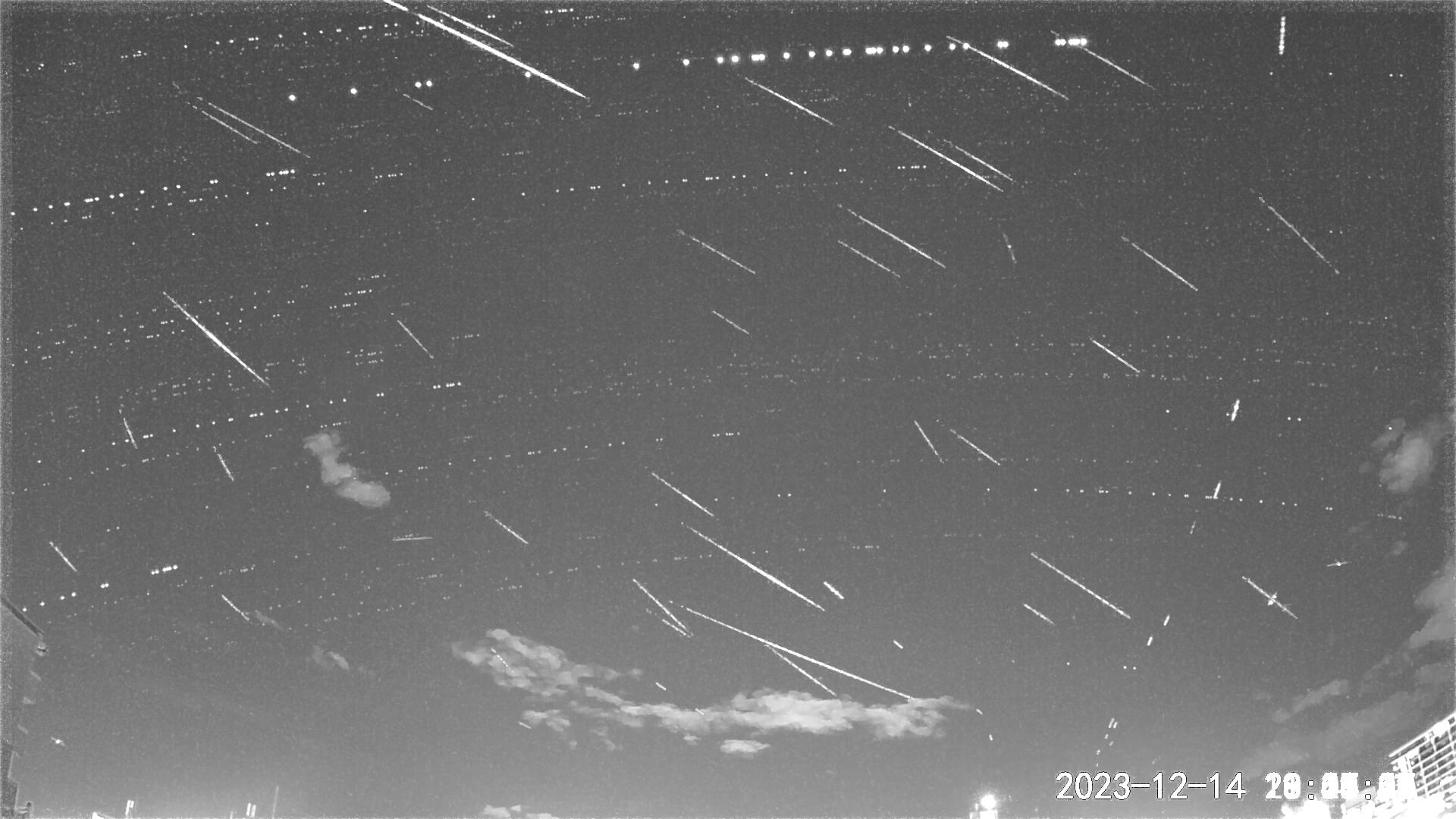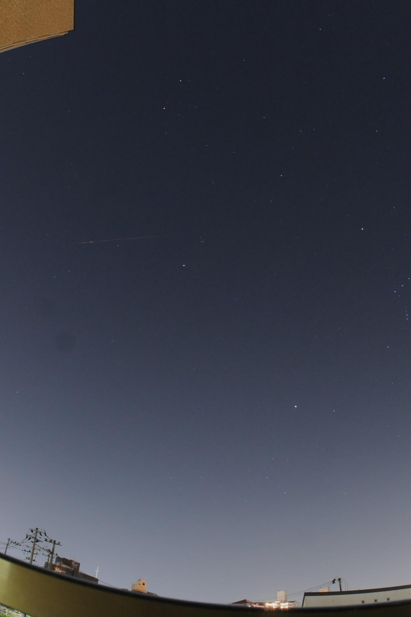 撮影中1秒露出を連続したら、偶然-2等のふたご座流星群が雲の隙間から流れました。
