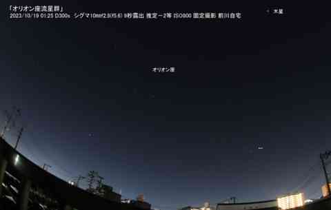 2023/10/19 自宅撮影の観測写真に1:25のコマにこの日一つだけ写っていたオリオン座流星群のものと思われる流星がありました。推定光度は-2等と見えます。
