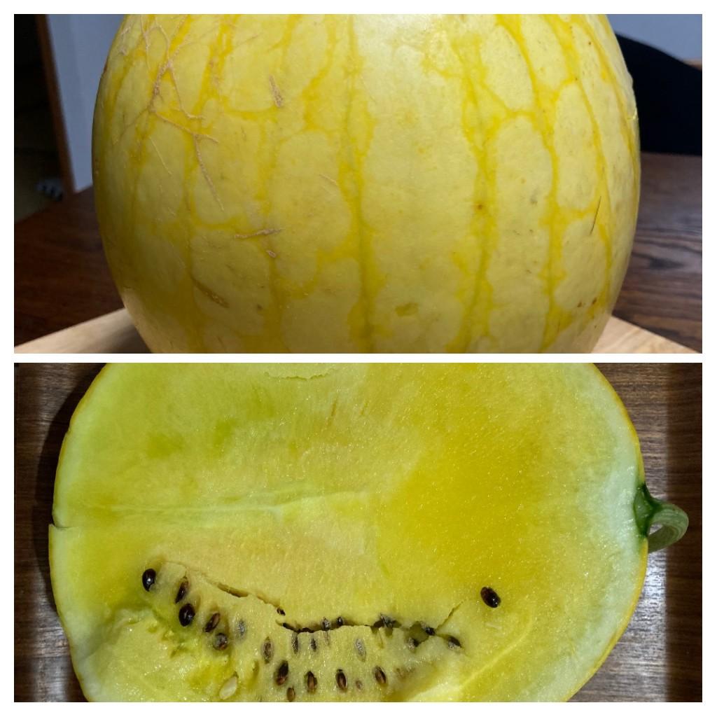 リタイアを機に市民農園を借りて畑仕事をやっています。今年は珍しいものができました。皮が黄色で中身も黄色のスイカです。甘いです。昨年交配した種から栽培しました。