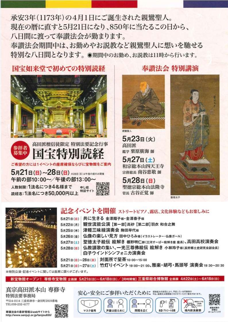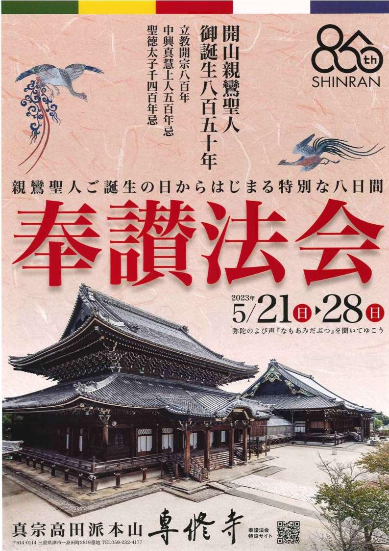 真宗高田派では、5月21日(日)から8日間、「奉讃法会」が勤まります。