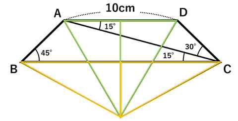△AOBと△DOCはおなじみの面積が求められる二等辺三角形(30°、75°、75°)であるため、10cm×5cm÷2×2=50cm^2(答え)