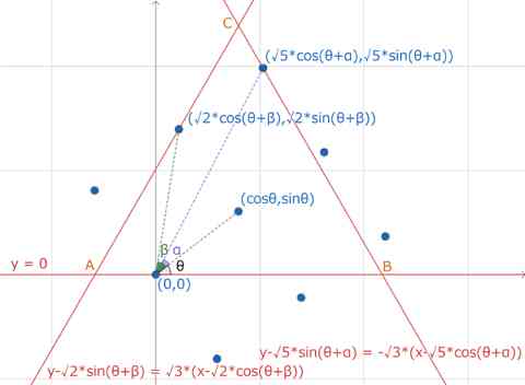 蟺BCã®åŸãã¯-â3ãªã®ã§ãçŽç·BC㯠y-â5*sin(Ξ+α)=-â3*(x-â5*cos(Ξ+α)) ã