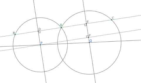 ãåPãšåQã2ç¹A,Bã§äº€ãããç¹AãéãçŽç·ãšåP,Qãšã®A以å€ã®äº€ç¹ã