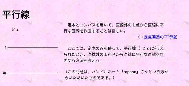 ããã§ã¯ã宿šã®ã¿ã䜿ã£ãŠãå¹³è¡ç· l ãšmãäžãããããšããçŽç·å€ã®1ç¹PããçŽç·ã«å¹³è¡ãªçŽç·ãäœå³ããæ¹æ³ãèããã