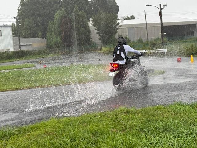 雨は私のような中級未満ライダーには練習の強い味方のように思います。雨という状況が「バイクを立てる」意識を強め、旋回に入る前に「バイクを寝かせ過ぎないようにしたい時は外側のステップを押せ(←内藤先生に何度も言われました!)」を思い出させてくれました。 晴れている時は、たくさん教わったことの一つしか意識できない私ですが、雨という悪条件が必要なことを呼び覚ましてくれたように思いました。SRTTに3年通い続けて反復練習したことが脳の奥底に蓄積されているような感じがして、公道で雨の中を走る時にも同じように必要なことを思い出せる気がしています。SRTTで練習を続けることの意味を実感できました。 ツーリングで雨に遭うのが楽しみです(笑)。