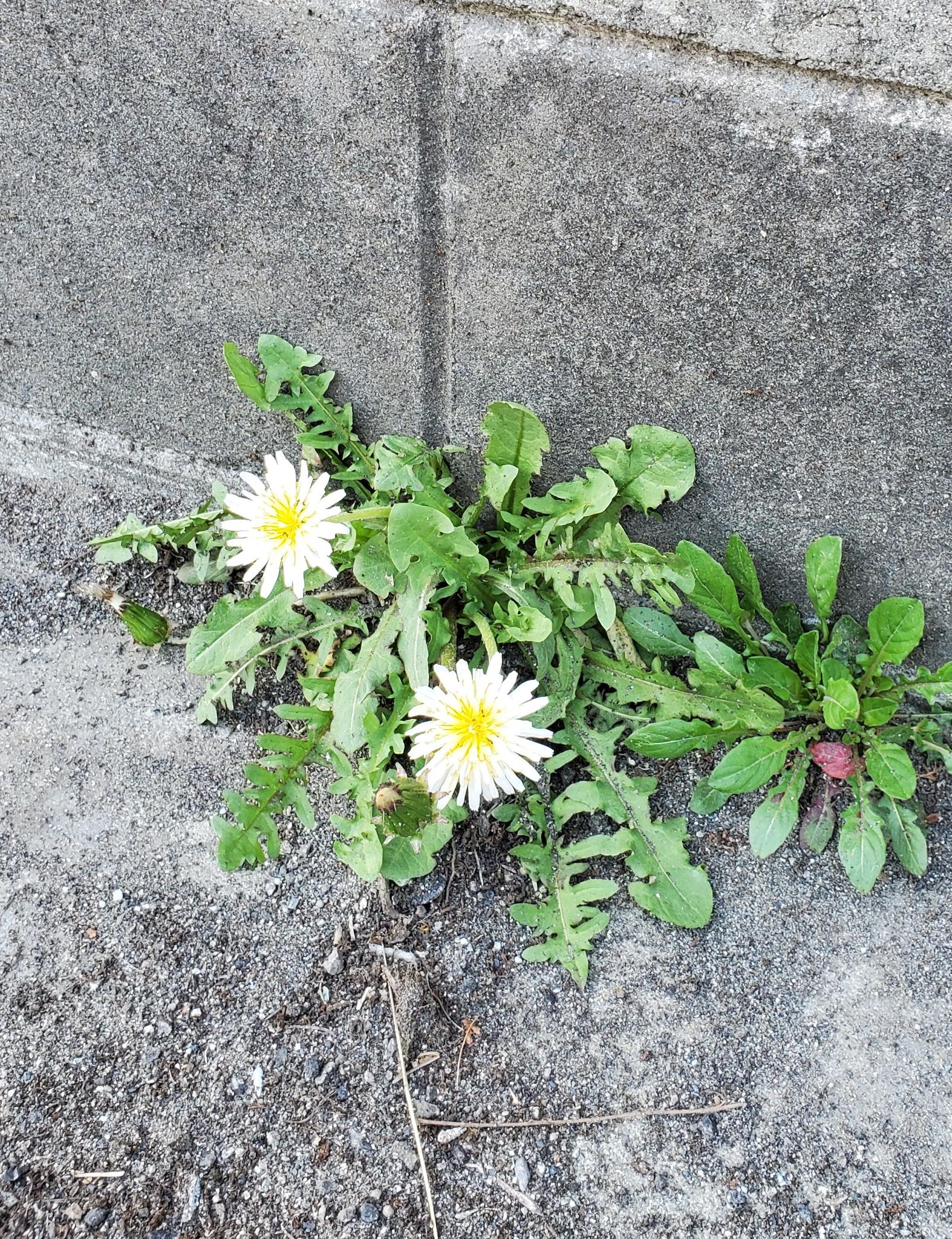 そんな中で写真を写したのが「ど根性シロバナタンポポ」。タンポポの場合はアスファルト舗装の隙間に生えてくる場合も少なくなく、ど根性とは大げさかもしれませんが、倉庫の基礎のコンクリートブロックと犬走りの間の隙間に生えており、周辺にあるもっと生育に適したと思われる場所には全く生えていませんでした。