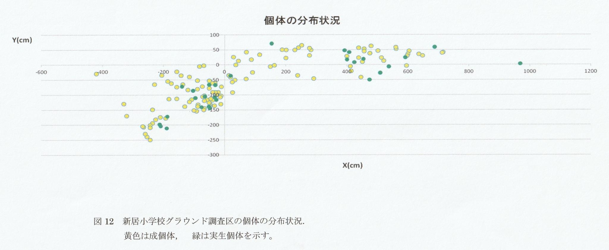 調査の結果実生個体は、そのほとんどが成個体の分布の範囲内に分布していました。散布された後発芽に至らない痩果もありますので、実生株の位置=散布域にはなりませんが、考えられているほど広範囲には散布されていないことが分かりました。タンポポは風散布の代表のようにとらえられており、綿毛で遠くへ飛んでいくようなイメージがありますが、実際は多くの次世代が親のすぐ近くで育っています(成個体と実生個体の分布図の一つを画像で添付しました。黄色が成個体の位置を、緑が実生個体の位置を示します)。