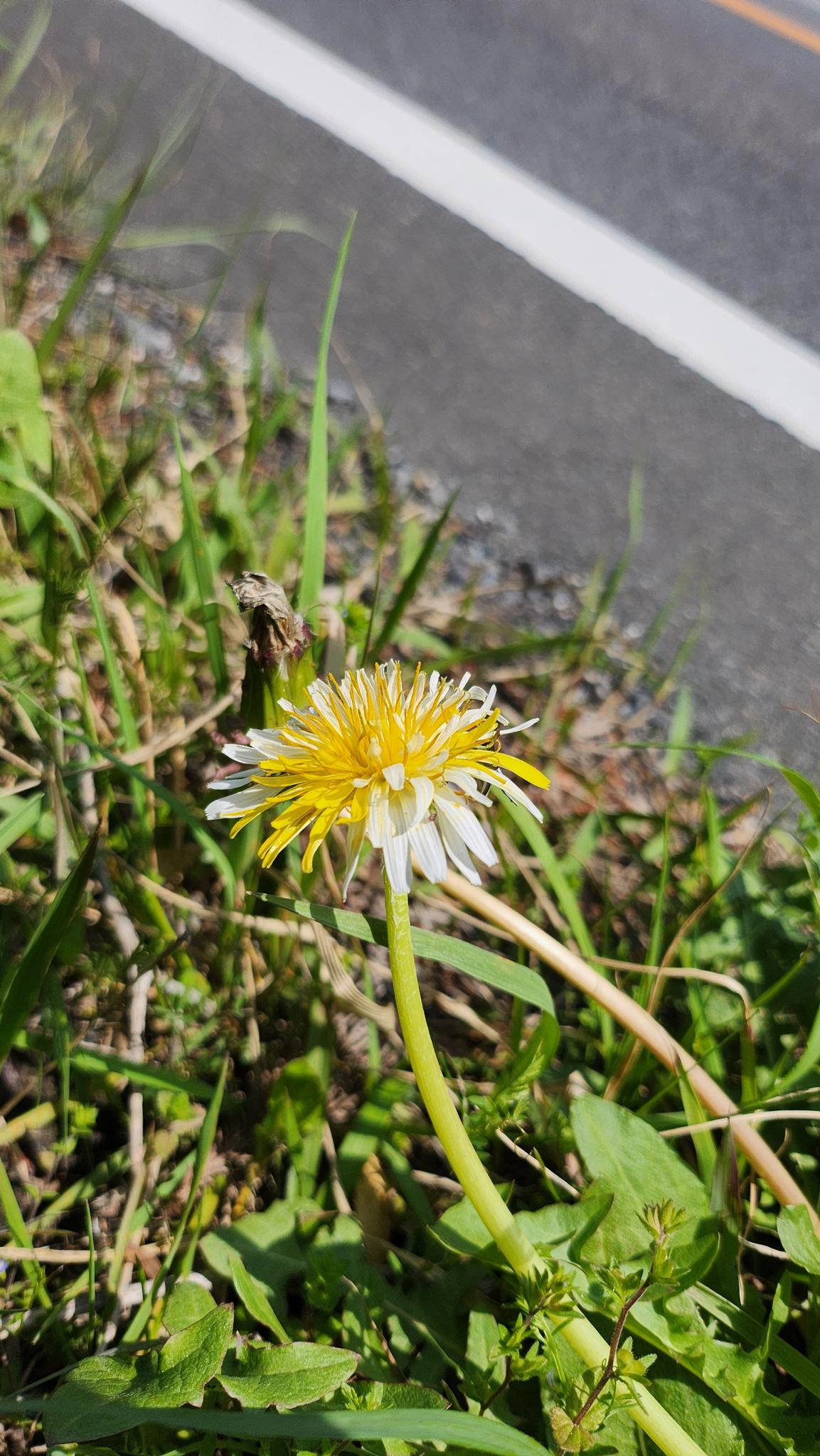 帰るために反対車線の取り残しを調査し、最後の群落でキバナシロタンポポを見つけました。ふと目を横に移すと、花の半分が白で、半分が黄色のタンポポがあるではありませんか!うーん、あなたは、キバナシロタンポポ?それともシロバナタンポポ?(写真を撮ったのですがきれいに半分に分かれて写っていませんでした。標本としては採集しています。)