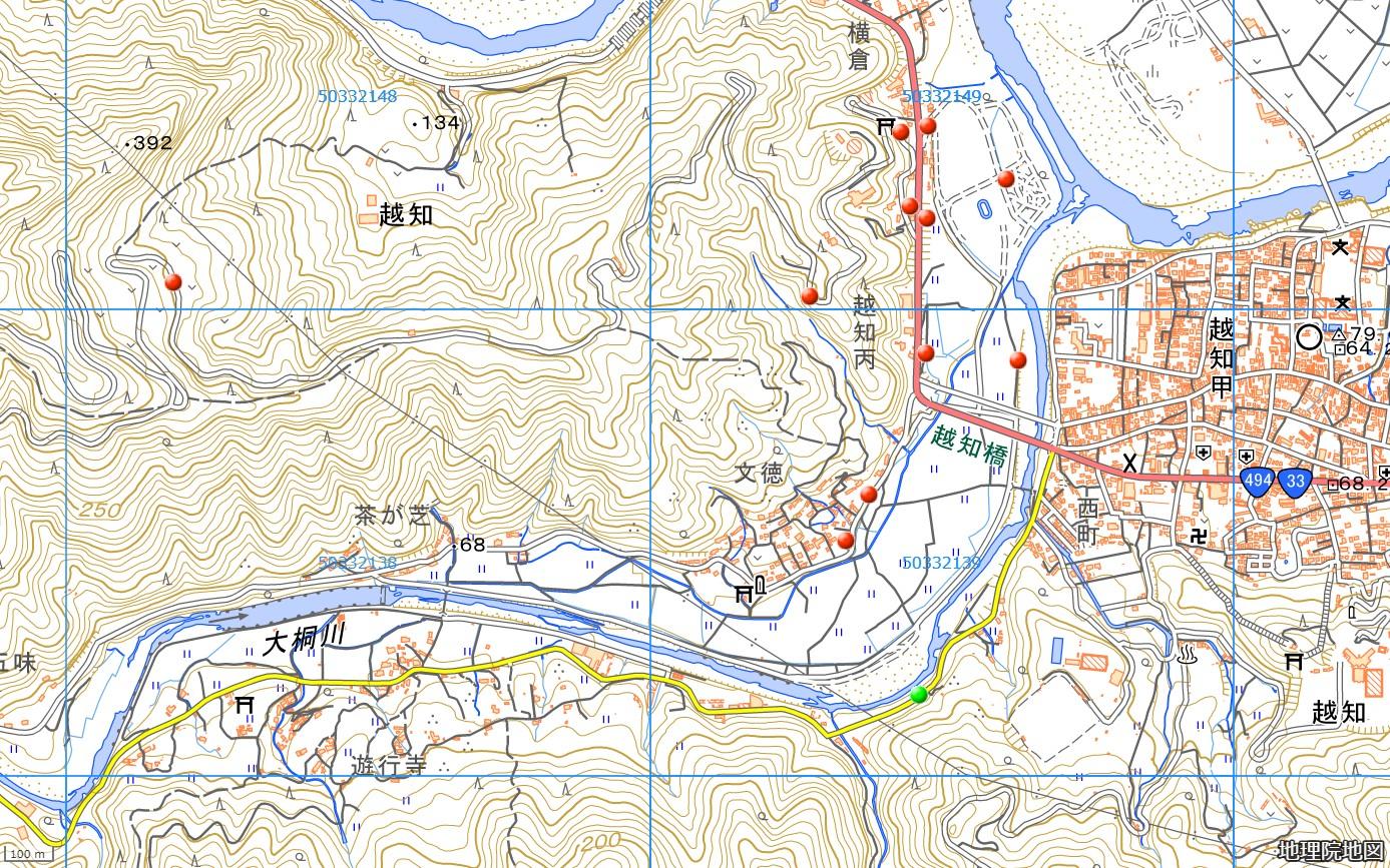 2015年調査ではきちんとした踏査調査をしていますので、その結果に今回新たに見つかった場所を地図に落してみました。赤丸が2015年調査で確認した場所、緑の丸が新たに確認できた場所です。