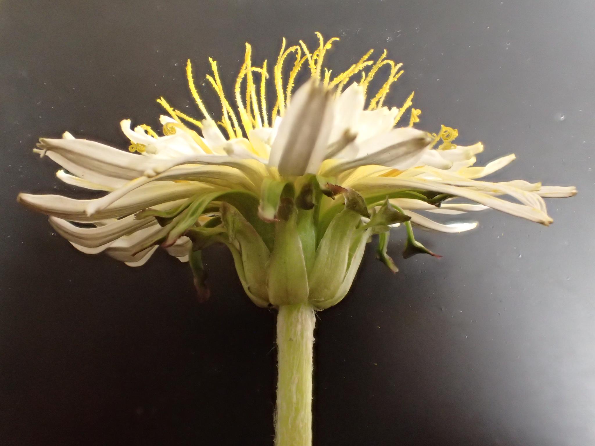 以前にも書きましたが、開花の初めころにはこのような形態のシロバナタンポポが多いとみています。