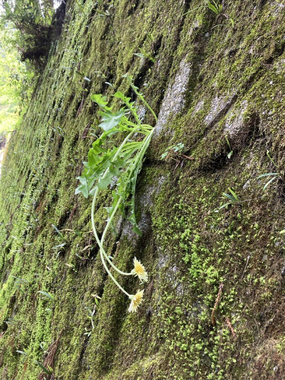 仁淀川町のタンポポサロンの一つ喫茶まるはちにてスパイスカレーを食べ、12:30にスタート。早速現場周辺上名野川に向かいました。最初に車を止めたところでは確認できず、さらに車を進めていくと、すると車道沿いに「ど根性キビシロ」を発見(写真をご確認ください)。車を降りて車道沿いを探索すると5株ほど、花茎があがっていたキビシロを確認することができました。いわゆるタネ(果実)は一つもなく花のみでしたが、以前愛媛県で確認したキビシロと同じスレンダーで背が高い容姿をもつキビシロタンポポです。その後、集落を探査し、車道沿いだけではなく、集落内の小径にもキビシロが生えていることがわかりました。信野さんがしっかりと生育地を確認、今回の調査ではタネを確認することができなかったので、タネが出来たときに再調査を依頼しました。