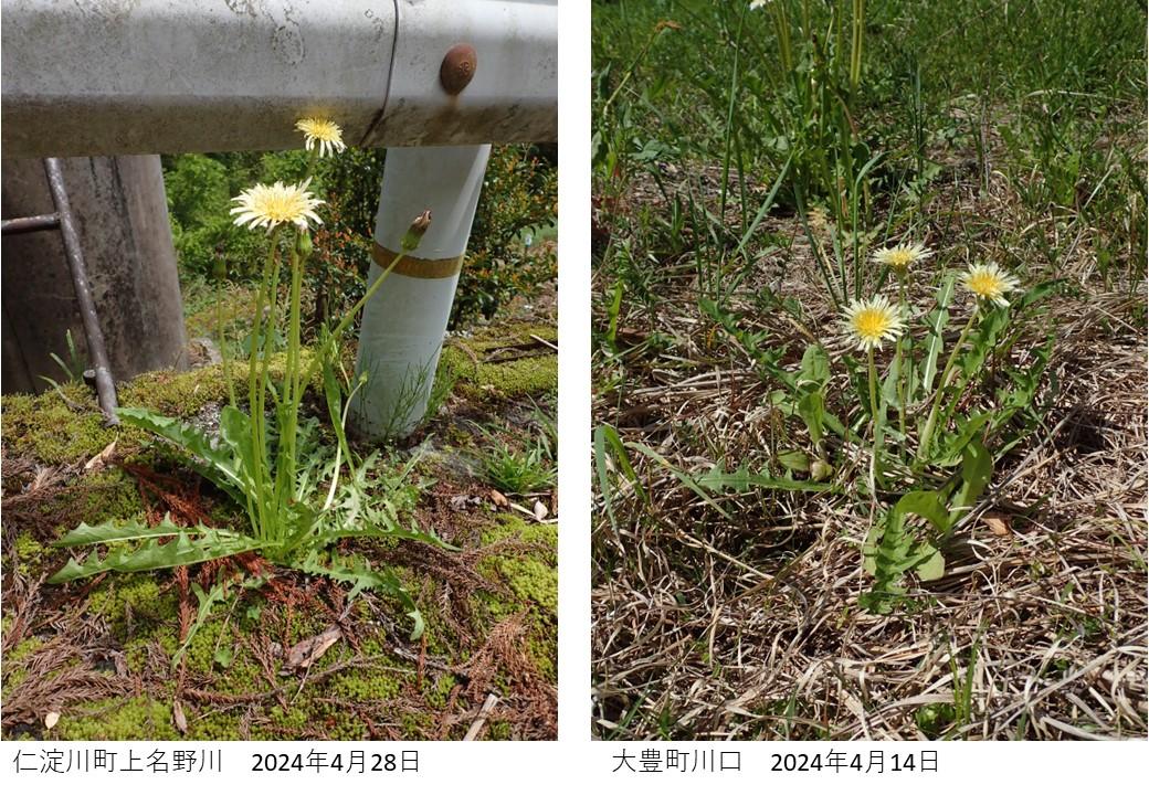 藤井さんが、仁淀川町上名野川から槇ノ谷方面へ、植物探査へ向かおうとしていたとき、車窓から車道脇に群生するセイヨウタンポポの黄色い花の中に、ぽつんと淡い色のタンポポを発見。この時に車を止めようとするも、後ろから来た車2台に道を譲れる場所がなく、そのママ採集できずに通り過ぎる。その後で、車を走らせたところ、再び、淡い色のタンポポを確認。道路沿いに2株を確認し、写真を撮影し、花を採集して事務局へ提出されました。