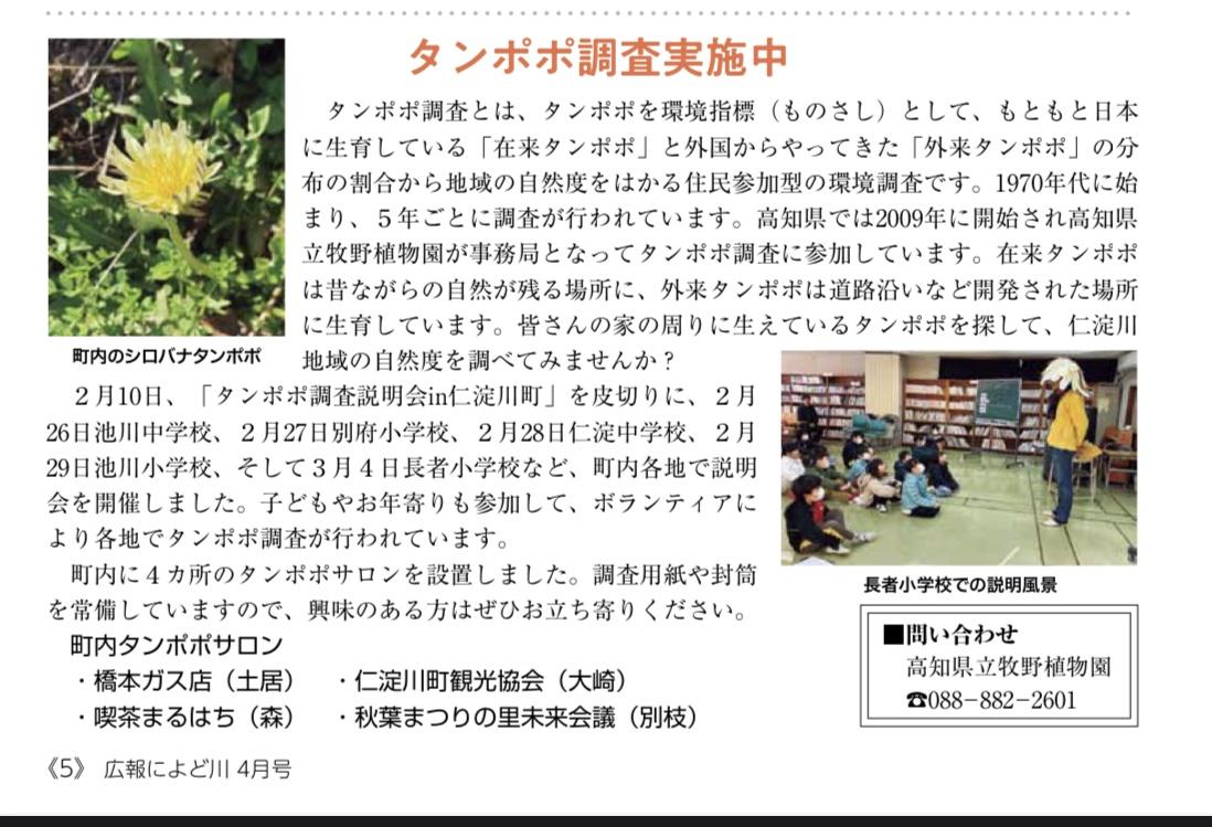 4月1日発行の仁淀川町広報誌に、遅ればせながらタンポポ調査について掲載されています