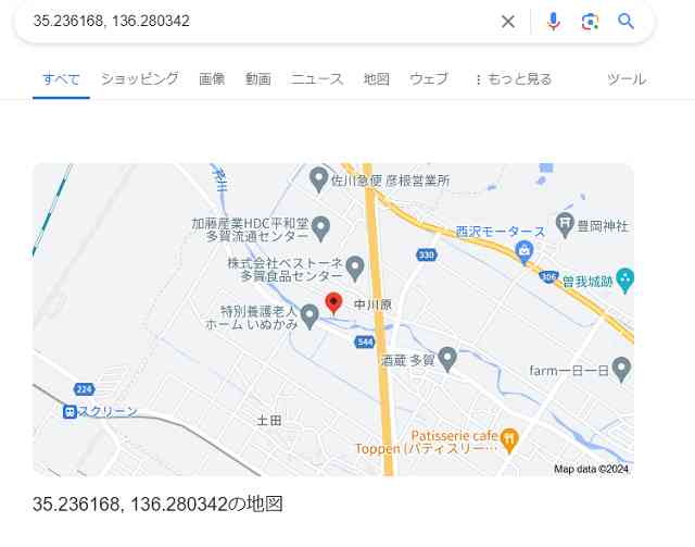google earthで検索しましたが、芹川では上記の緯度、経度は見当たりませんでした。
