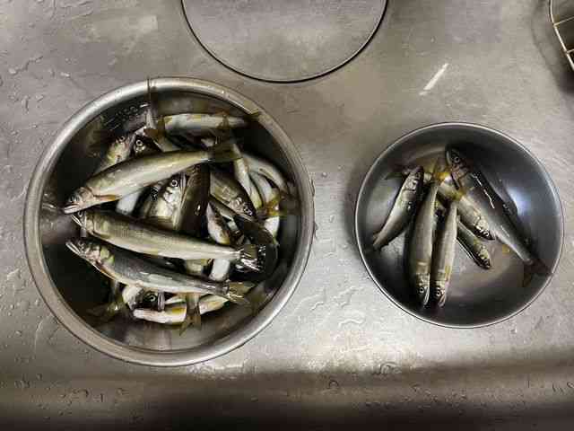帰るには早いので石田川で少し竿出ししましたがこっちはカワムツとヌマチチブが入れ食い、絞り込みの瀬を狙って何とか鮎6尾追加、こっちも真っ黒鮎で琵琶湖から上ってきたふっくら鮎はいません。添付写真左が知内川、右が石田川の鮎です。