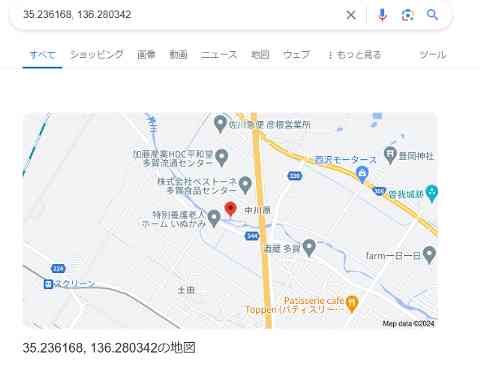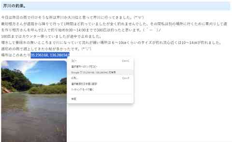google earthで検索しましたが、芹川では上記の緯度、経度は見当たりませんでした。