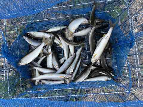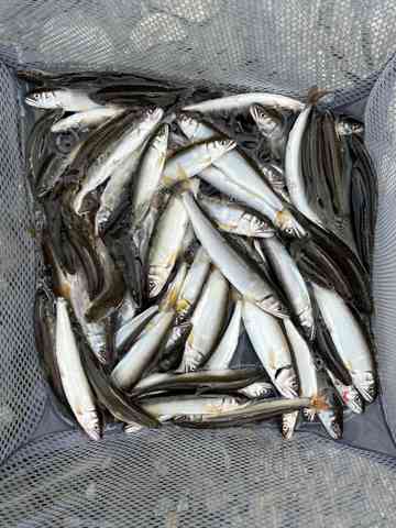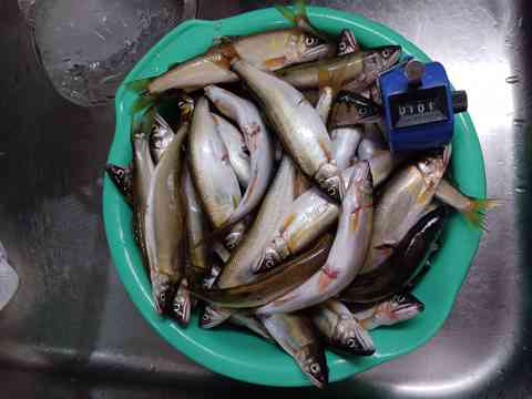 知内川では朝5時半~9時過ぎで40尾870g、大崎浜では10時~13時過ぎ(雷雨のため30分中断)で140尾1120g。知内川は多分投網師にごっそりいかれましたね、土曜日はよく釣れたそうですがエグい激流の釣り辛い&投網無理なピンポイントでしか釣れなかったです。ただし釣れると全部デカいです、最大17㎝で12㎝未満なしでした。写真は知内川釣果です。