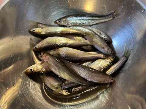 ニゴイ、フナ、ヨシノボリ、ブルーギルの邪魔が入りましたが、なんとか食べ頃サイズのホンモロコ30匹確保。小さいのを入れたらトータル50匹くらいの釣果。