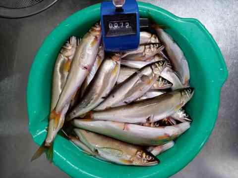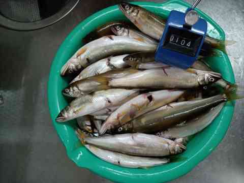登りたての小鮎ばっかりで白くてふっくらが多かったですエサはシラスを2時間・その餌無し30分・あとの3時間は煮干し粉でした。