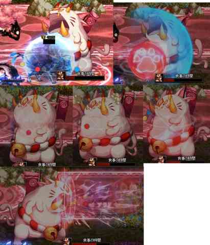 アラド戦記 無限花序ダンジョンの庭園ルートのボス 桜巫女ボドナリが呼び出すマホがプレイヤー飲み込み、吐き出す攻撃をしてきます 攻撃が当たると肉球がついた玉のようなものに変化させられてそのまま呑まれて少しすると吐き出されます