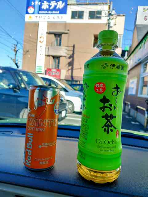 旅のお供に近くのファミマで『RedBullウインターエディション&お〜いお茶』調達♪