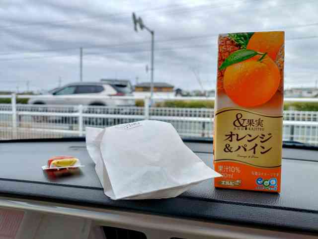 浜の近くのファミマで『トルティーヤドッグ&オレンジ・パインジュース』調達!!