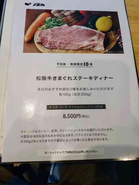 1日10食限定の『松阪牛の気まぐれステーキディナー』に
