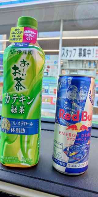ファミマで旅のお供に『Red Bull&お~いお茶』調達♪