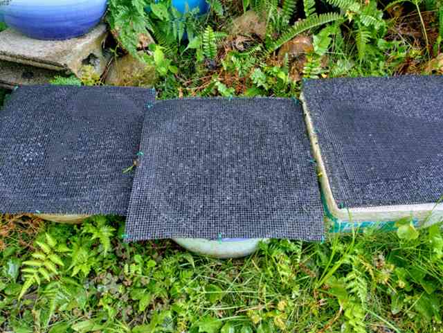 左右の他の水鉢はミジンコが暑くて半減、急ぎカインズとダイソーで材料調達で