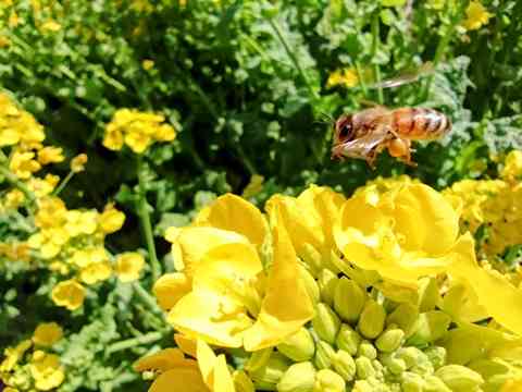 道端の菜の花でミツバチが花粉集め、ミツバチは温厚な性格なので