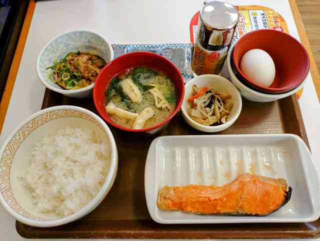いつものすき家でアサメシ!!『焼鮭かけたま朝食』、コシヒカリが美味しくて