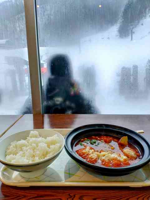 ヒルメシはいつもの『鉱泉ヒュッテ』でゲレンデを眺めながら、【トマトチーズチキン】を!!