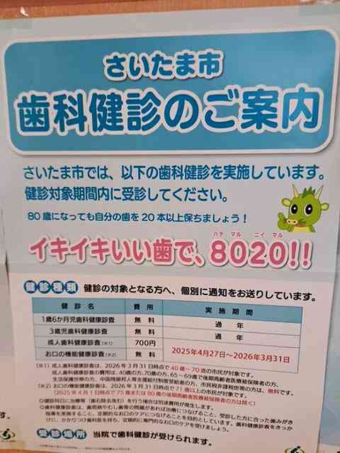 「さいたま市の歯の無料検診は「2025.04.01」時点で75歳、80歳の人なので、私は6/5生まれですから対象です。