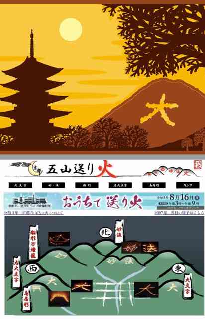 五山送り火は、お盆の精霊を送る行事で、東山に「大」、松ヶ崎に「妙・法」、西賀茂に「船形」、・・・