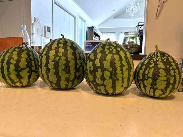 写真のスイカの左から2つ目を我が家に持参するとのことです。
