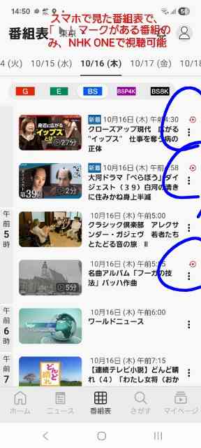 又、NHKの下記回答では、BS放送は、スマホでも「NHK ONE」で、見逃し配信番組など視聴が出来ないやの説明ですが、実際は一部番組かも知れませんが、私は見られました