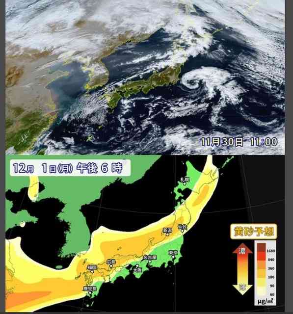 30日(日)の気象衛星画像と12月1日(月)午後6時の黄砂の予想ずを観て下さい。