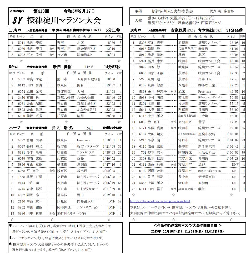 9月17日(日)に第413回摂津淀川マラソン大会が開催されました。