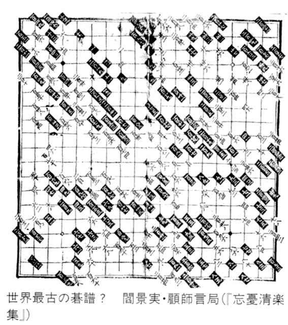 「忘憂清楽集」より世界最古の棋譜として信憑性の高い「閻景実・願師言の譜」です